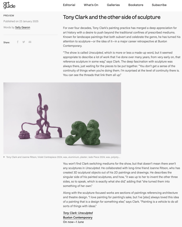 Installation view Tony Clark unsculpted exhibition at Buxton Contemporary, Melbourne, November 2024- May 2025Joanne Ritson, Vertical Umber, after a drawing by Tony Clark, 2022, aluminium, plasteline modeling clay 27 x 14 x 8 cm. Joanne Ritson, Horizontal Umber, after a drawing by Tony Clark, 2022, aluminium, plasteline modeling clay 16 x 22 x 20 cm, Photo Christian CapurroJoanne Ritson, Violet Centrepiece, after a drawing by Tony Clark, 2024, pigmented wax, aluminium, plaster, 36 x 35 x 15 cm. Photo ChristianInstallation view Tony Clark unsculpted exhibition at Buxton Contemporary, Melbourne, November 2024- May 2025Joanne Ritson, Bronze Sequence, after a drawing by Tony Clark, 2024, pigmented wax, aluminium, polystyrene , 21 x 25 x 11 cm. Photo Christian Capurro Joanne Ritson, Upright Pair, after a drawing by Tony Clark, 2024, aluminium, plaster, cotton, 42 x 11 x 13 cm. Photo Christian CapurroJoanne Ritson, Standing Saffron, after a drawing by Tony Clark, 2024, aluminium, plaster, cotton, acrylic paint 49 x 29 x19 cm. Photo Christian CapurroJoanne Ritson, Jasperware Arrangement, after a painting by Tony Clark, 2025, aluminium, cotton, hessian, plaster, 52 x 130 x 30 cm Installation view photo Christian CapurroJoanne Ritson, Double Ochre, after a drawing by Tony Clark, 2024, pigmented wax, aluminium, cotton, 46 x 30 x 30 cm. Photo Christian CapurroInstallation view Tony Clark unsculpted exhibition at Buxton Contemporary, Melbourne, November 2024- May 2025. Photo Christian CapurroJoanne Ritson, Red Variation, after a drawing by Tony Clark, 2024, pigmented wax, aluminium, cotton, 34 x 30 x 30 cm. Photo Christian CapurroJoanne Ritson, Jade Piece, after a drawing by Tony Clark, 2024, pigmented wax, polystyrene, 17 x 24 x 15 cm. Photo Christian CapurroInstallation view Tony Clark unsculpted exhibition at Buxton Contemporary, Melbourne, November 2024- May 2025